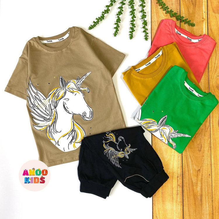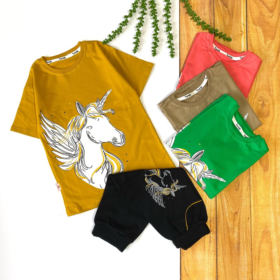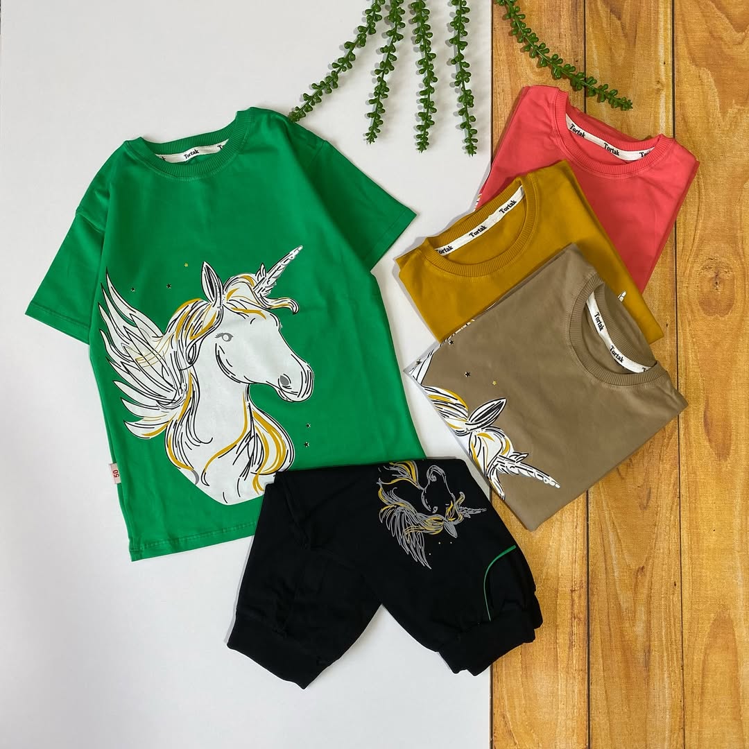 ست تیشرت و شلوارک دخترانه نخ پنبه مدل تک شاخ تورتک